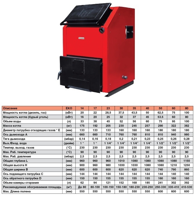 - – Основное топливо – кокс, уголь, дрова, торфяные брикеты. При необходимости можно использовать другие виды топлива, в базовой комплектации нижняя дверь котла оборудована отверстием под установку жидкотопливной, газовой или пеллетной горелки
